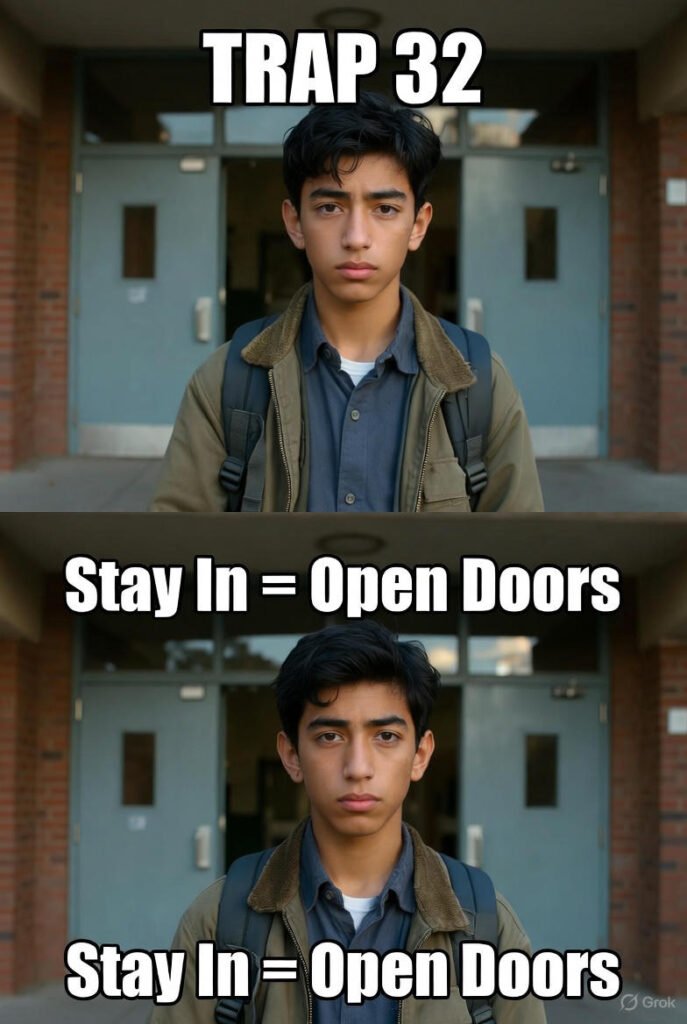 The “Dropping Out of School” Trap involves quitting education—whether high school, college, or vocational programs—before completing your diploma or degree, a decision that limits your opportunities and often leads to regret.