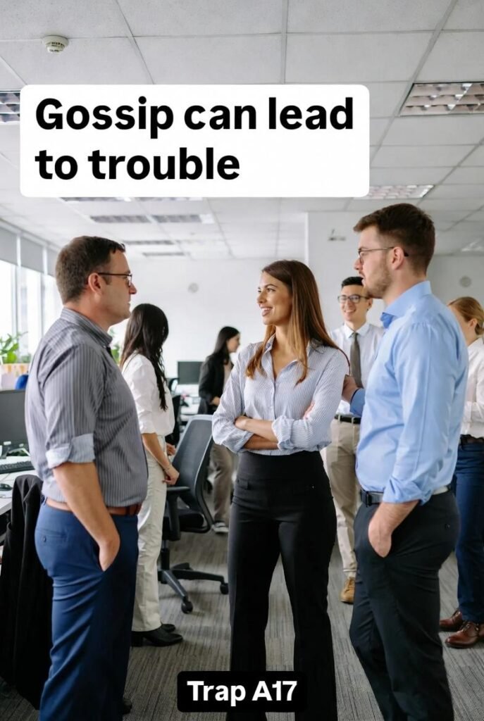 The “Workplace Gossip” trap involves engaging in or spreading rumors, personal information, or unverified stories about colleagues in professional settings, a seemingly harmless habit that can lead to conflict and distrust.
