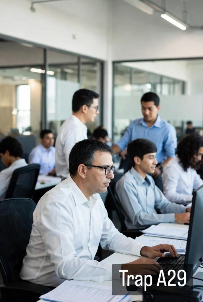 The “Career Stagnation” trap involves failing to pursue professional growth, such as neglecting skill development, avoiding networking opportunities, or staying in an unfulfilling role due to fear or complacency, leading to stalled career progress.